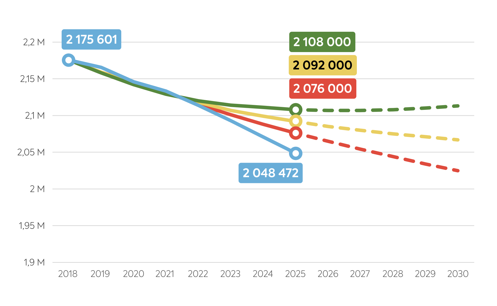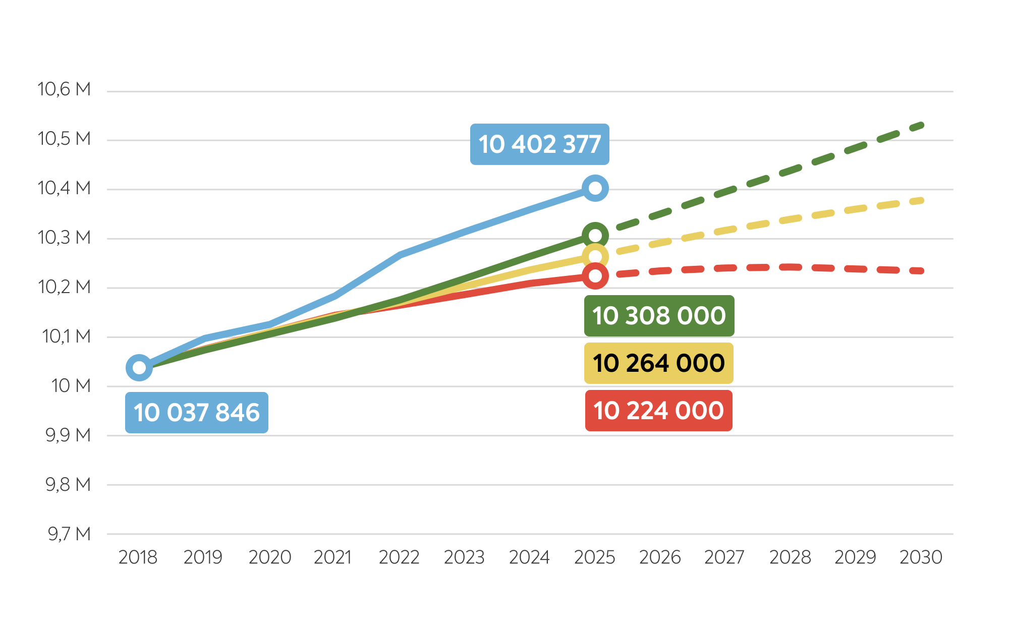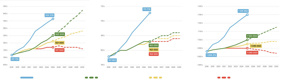 Au regard de la direction de la courbe d’évolution réelle de la population présentée ci-dessus, on constate cependant un infléchissement à partir de 2022 : un ralentissement lié à une natalité basse et au vieillissement de la population (de 40,6 à 41,7 d’âge moyen entre 2018 et 2025 – Insee) qui laisse augurer qu’à moyen terme, la population réelle devrait recoller aux scénarios de projection.