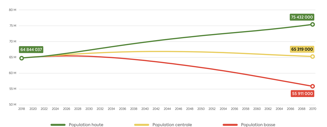 Tous les scénarios imaginés se situent dans un intervalle délimité par les scénarios « population haute » et « population basse » dont tous les paramètres sont respectivement les plus optimistes ou pessimistes. Le scénario « Population centrale » produit une estimation moyenne située entre ces deux scénarios.